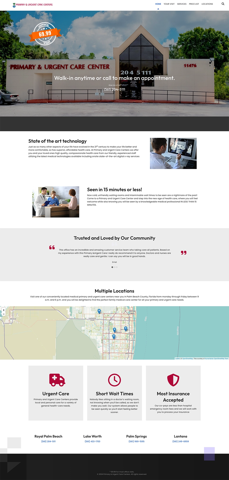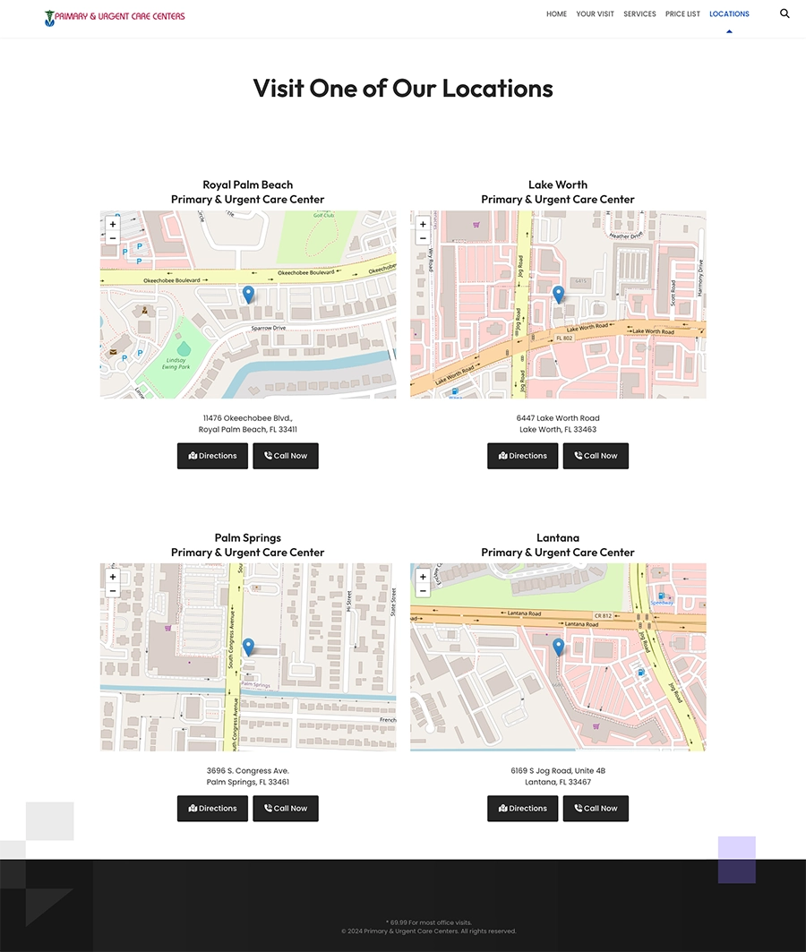 The Primary & Urgent Care Centers website is a vital resource for potential patients, providing clear, accessible information for each clinic location. By creating a responsive, patient-centered website, we’ve helped streamline access to healthcare information for the Palm Beach community. This project reflects our commitment to delivering websites that meet both the functional and informational needs of healthcare providers and their patients.