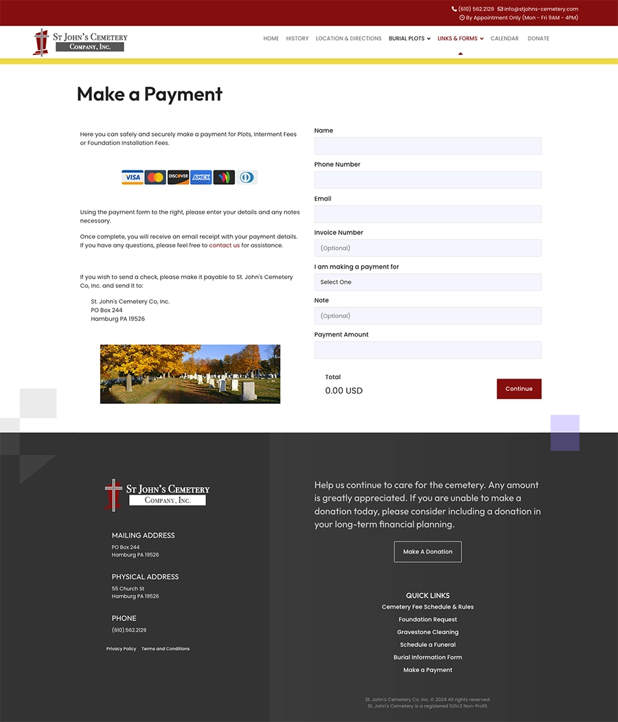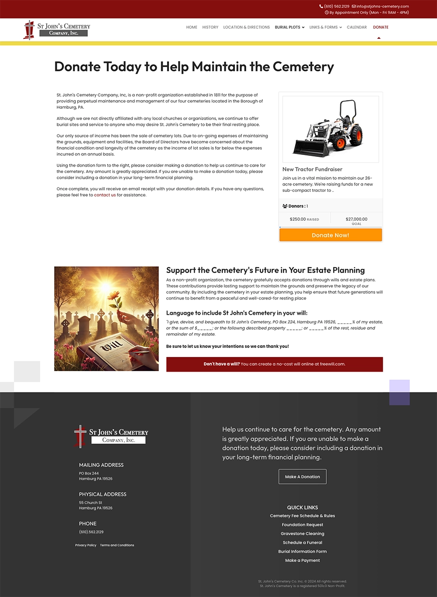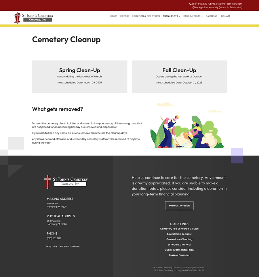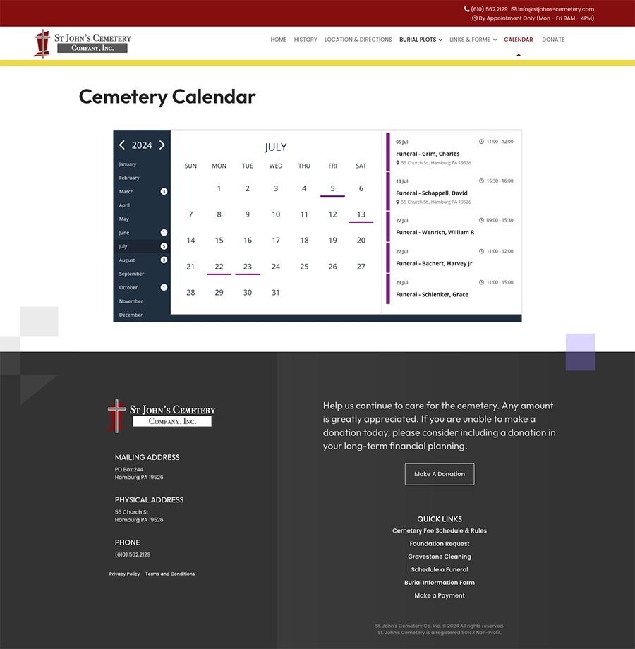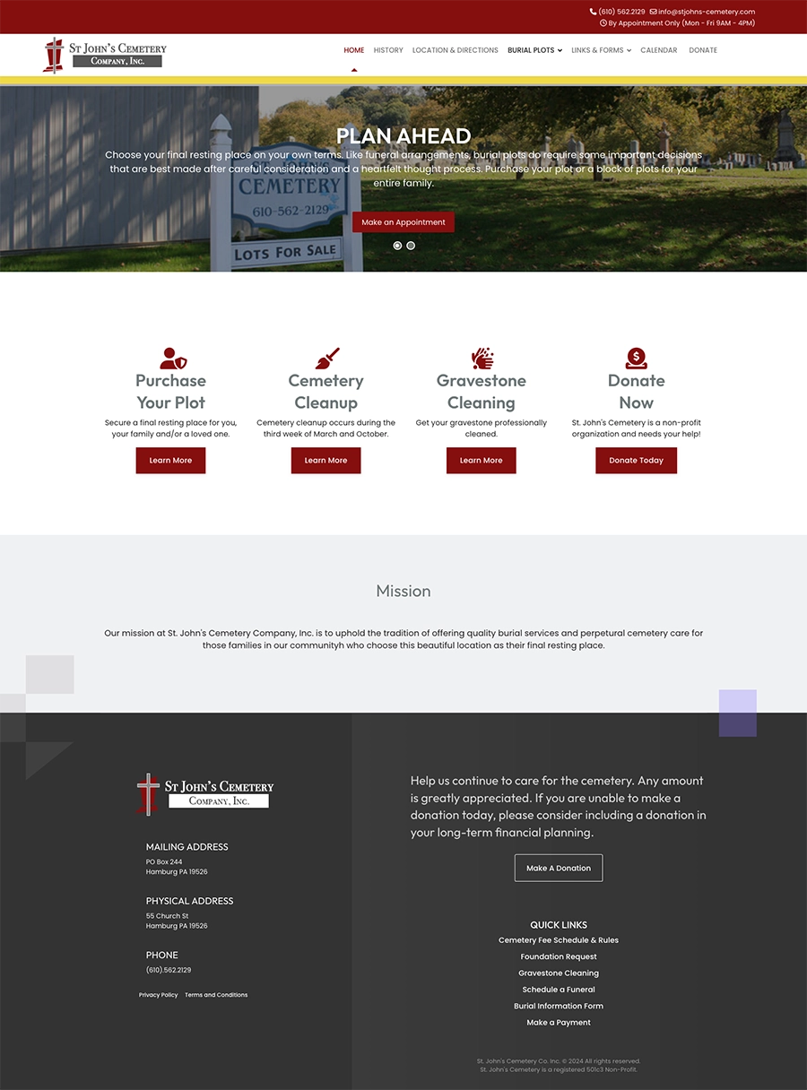 St. John’s Cemetery in Hamburg, PA, is a historic cemetery committed to honoring those who rest there, including over 800 veterans. We’ve had the privilege of supporting their mission through a variety of services, from website development and cemetery management migration to custom signage and maintenance solutions. This ongoing partnership reflects our ability to deliver tailored digital and physical solutions for unique client needs.