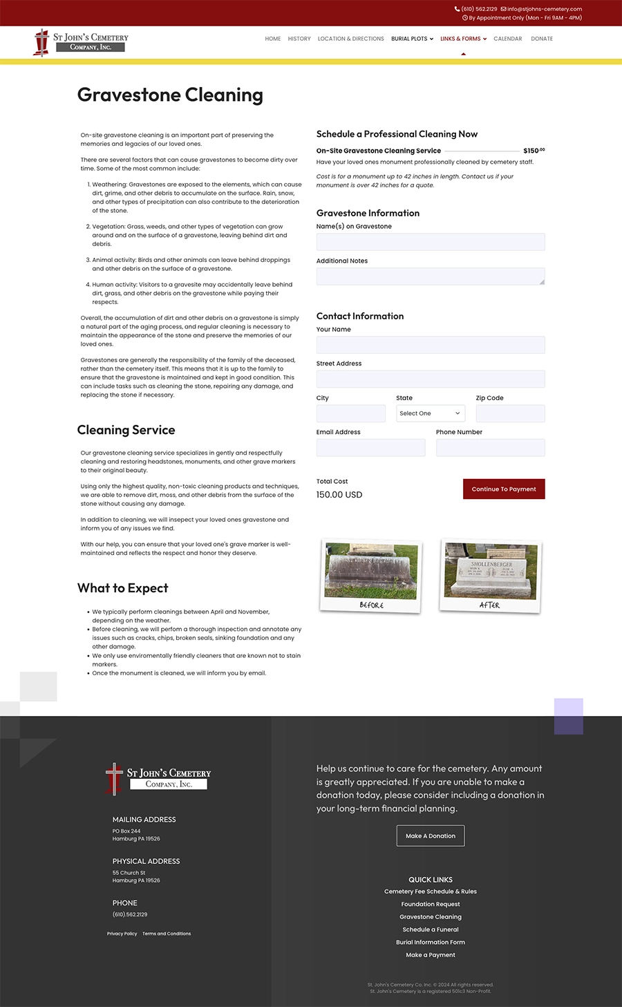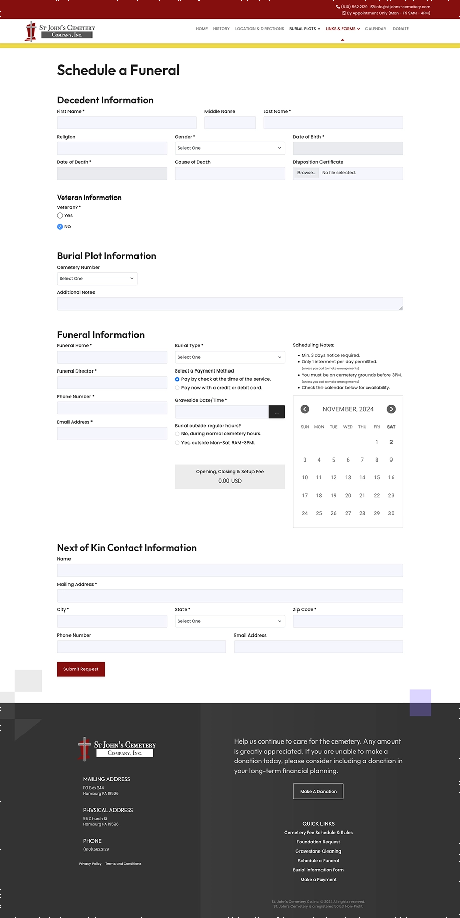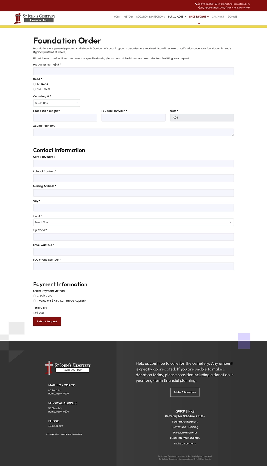 We initially built St. John’s Cemetery’s website on Joomla 3, and later migrated and updated it to Joomla 5. The site includes extensive form functionality with conditional fields for tasks such as funeral scheduling, foundation installation orders, and payments via Stripe. To simplify administration, we developed automatic calculations that offset processing and manual invoicing fees, making the ordering and payment process seamless.