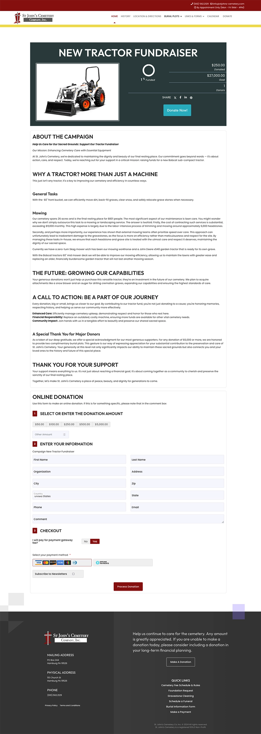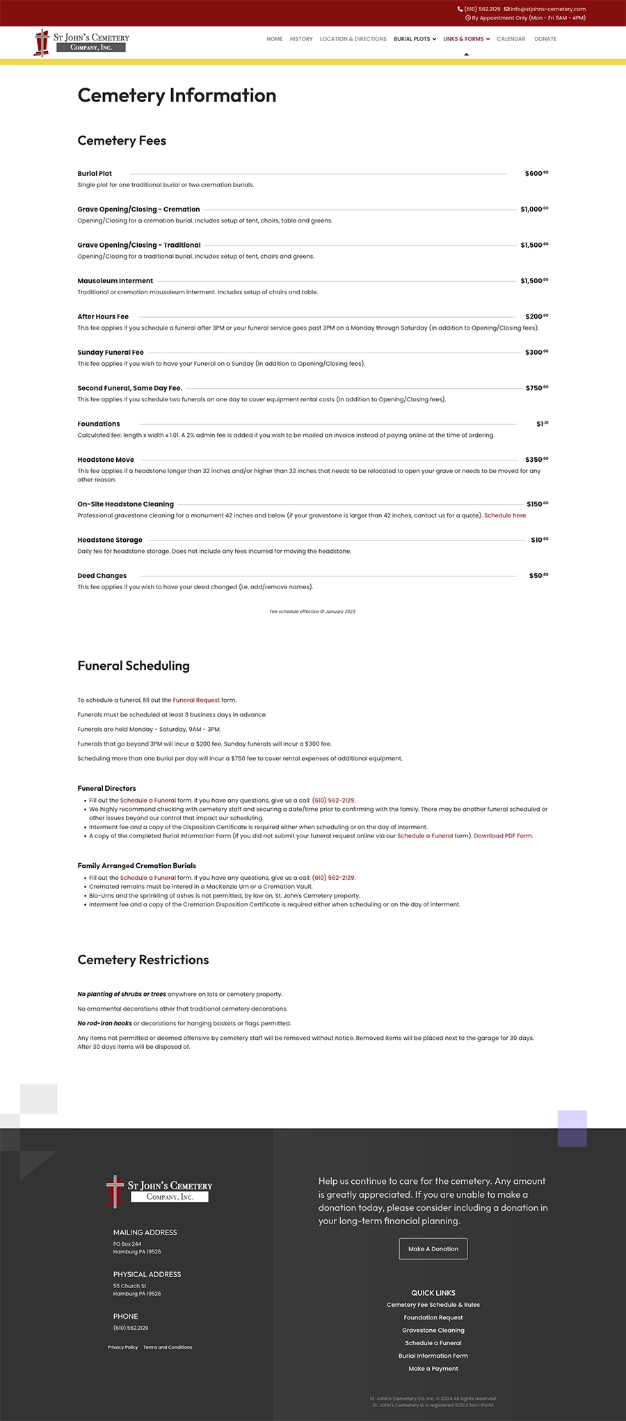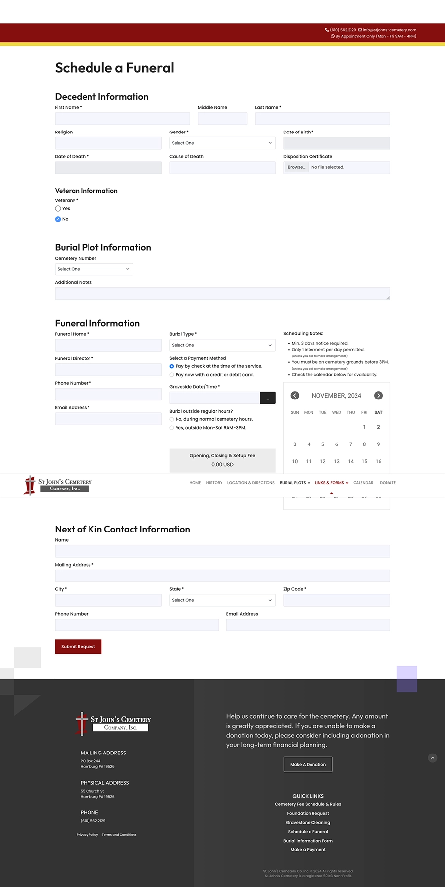 We initially built St. John’s Cemetery’s website on Joomla 3, and later migrated and updated it to Joomla 5. The site includes extensive form functionality with conditional fields for tasks such as funeral scheduling, foundation installation orders, and payments via Stripe. To simplify administration, we developed automatic calculations that offset processing and manual invoicing fees, making the ordering and payment process seamless.