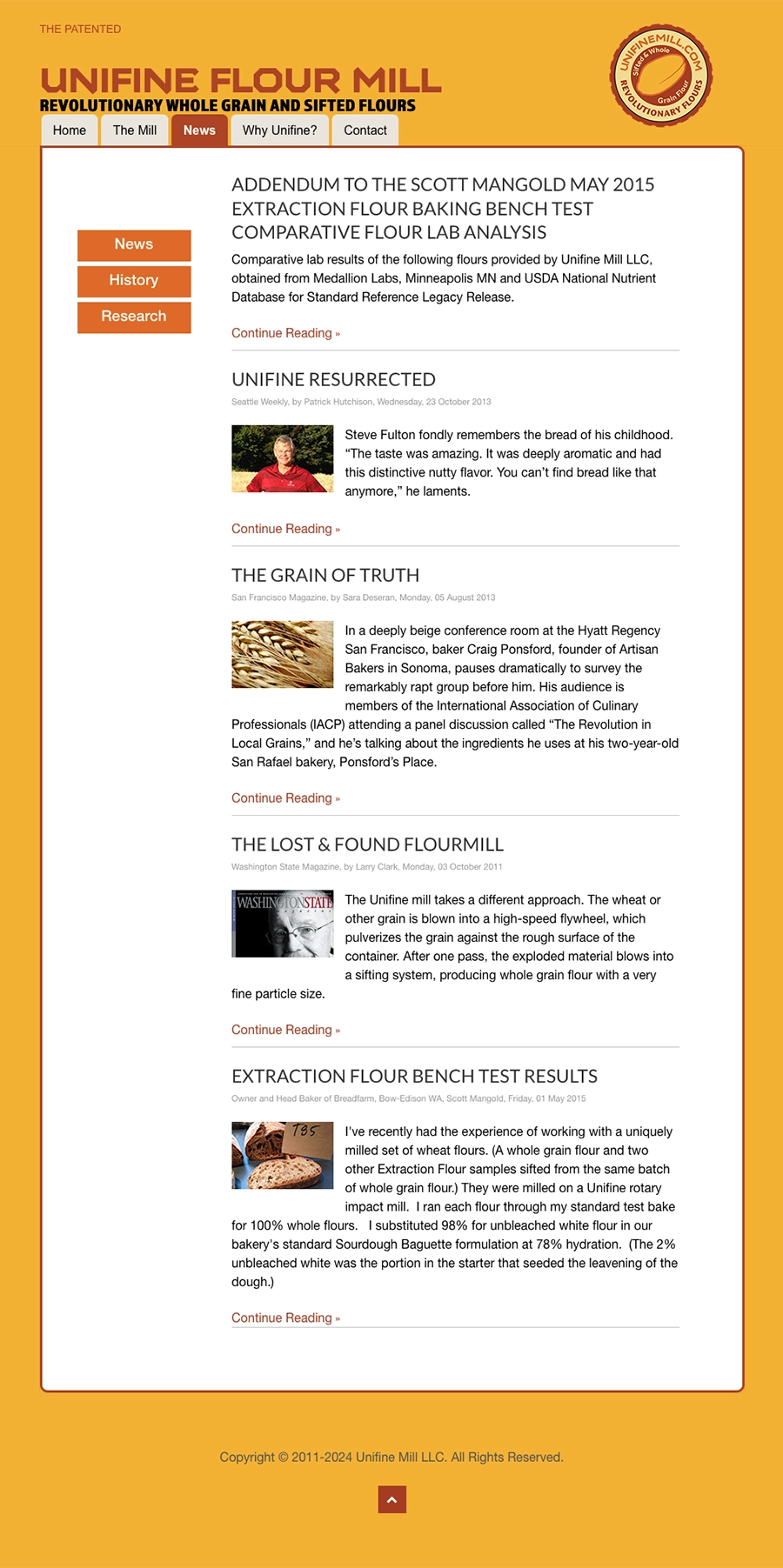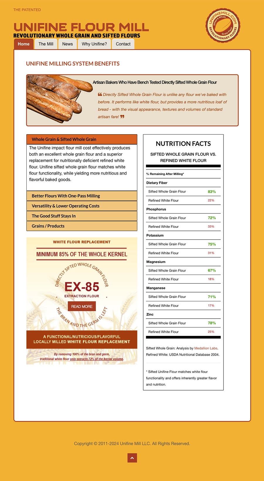 Unifine Mill LLC is at the forefront of innovative milling technology, offering flour products with superior nutritional value. To support their mission, we built a website that not only highlights their unique milling process but also educates potential customers on the benefits of Unifine-milled flour. The site includes a unique feature that showcases a nutrition comparison between Sifted Whole Grain Flour and refined white flour, emphasizing the health benefits of Unifine’s products.