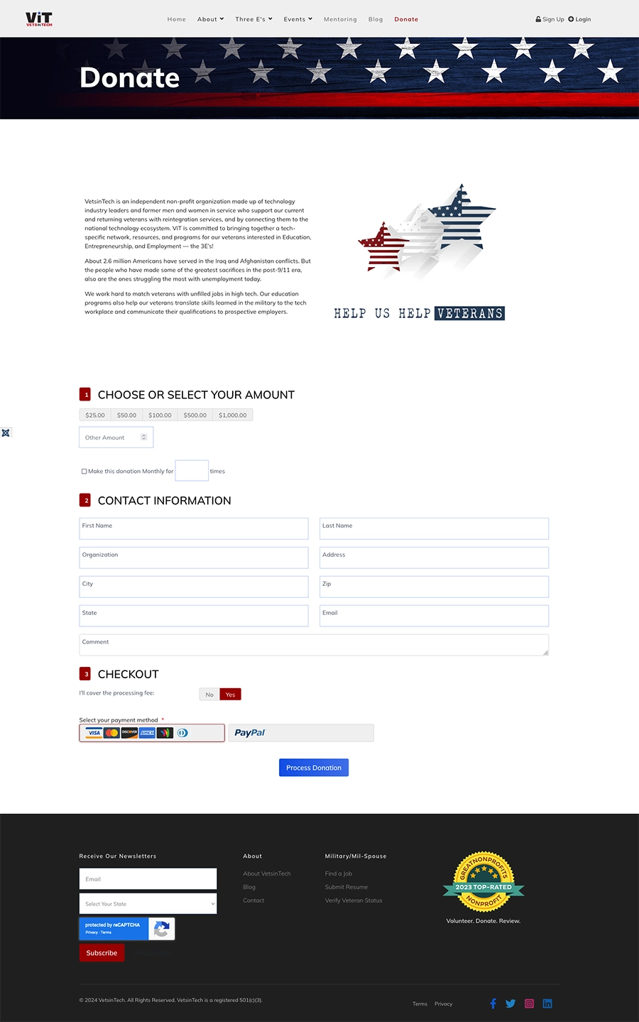 The site also includes donation functionality to support ViT’s mission, as well as Eventbrite calendar integration, automatically syncing ViT’s upcoming events for easy access.
