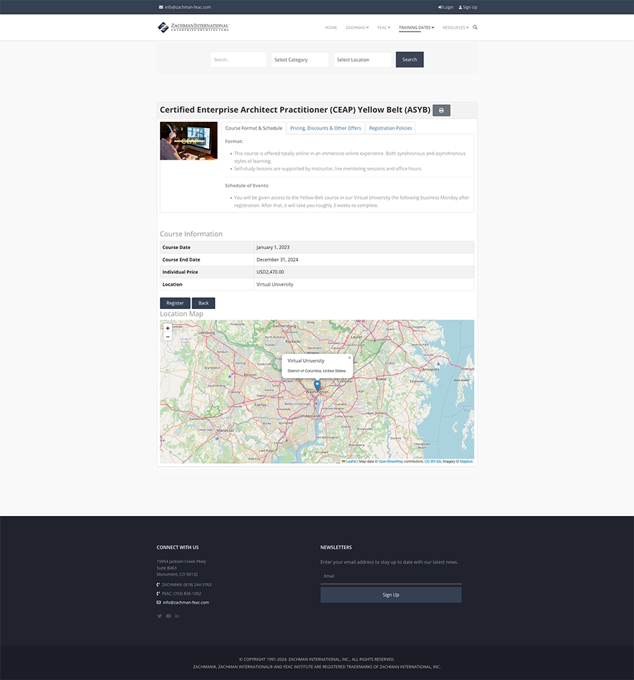 The original site was built on Joomla 2.5 and utilized a customized version of the Fabrik extension as a CRM system for managing users and their certifications. As technology advanced, we rebuilt the site on Joomla 3, migrating all user data to EasyProfile to offer a more robust, user-friendly experience. This migration preserved critical user data and provided the Zachman and FEAC teams with enhanced tools for certification management.