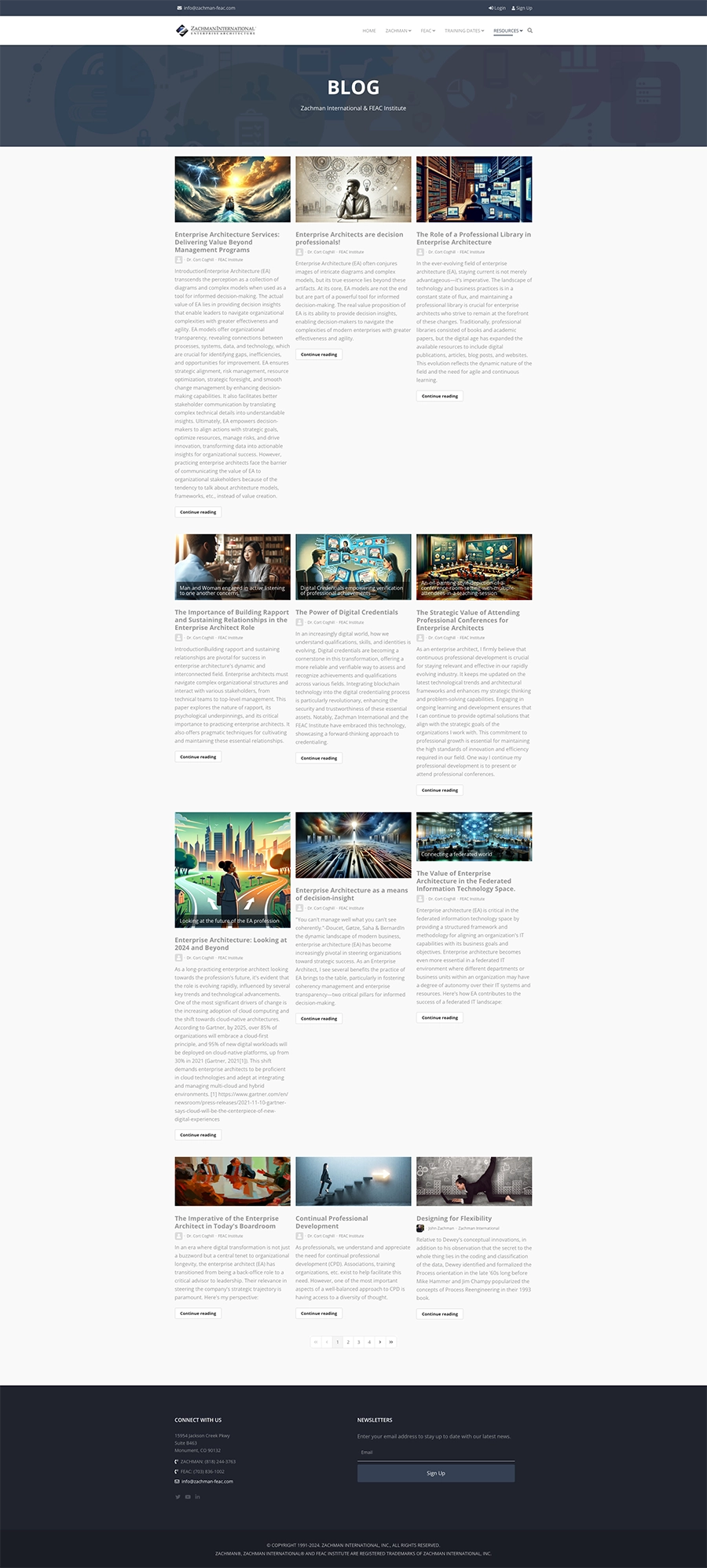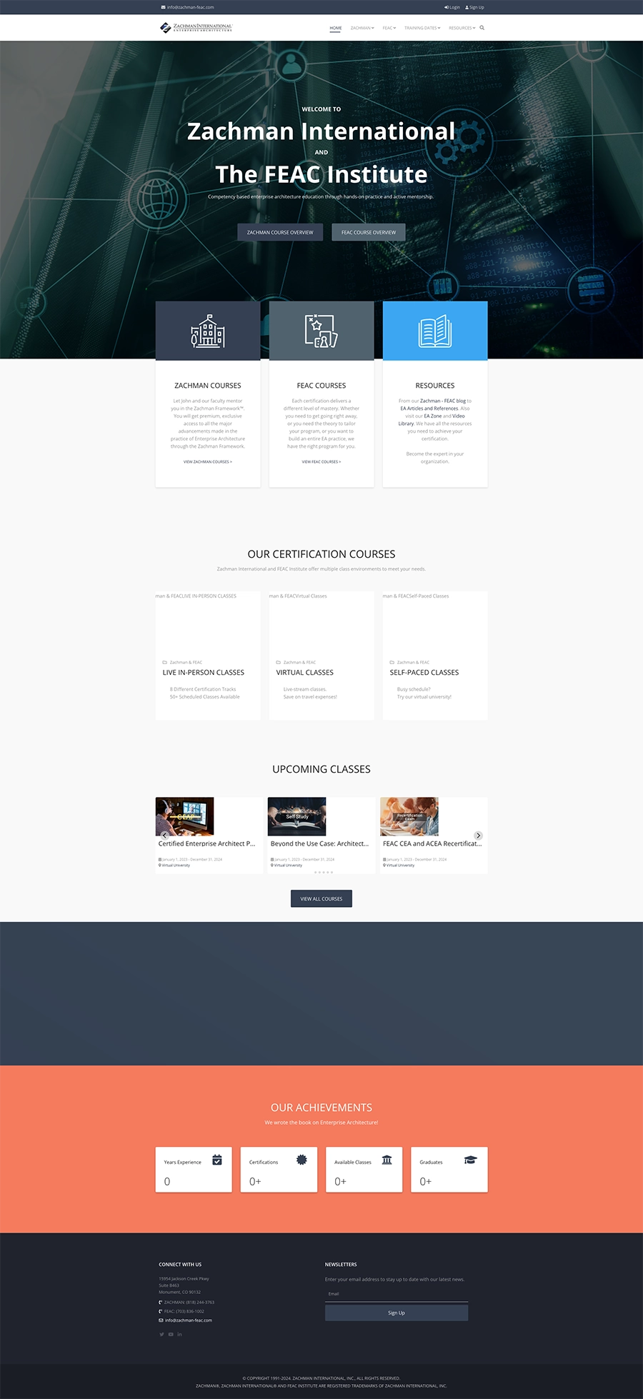 The Zachman Institute and FEAC Institute have been valued clients for over a decade. Initially, the two entities operated separate websites, each managed independently. To streamline business operations and simplify maintenance, we configured both domains to run off a single Joomla installation, allowing for unified asset management and centralized content updates. Eventually, we consolidated the two sites into one, with a single domain representing both entities. This consolidation not only improved efficiency but also strengthened their online brand identity.